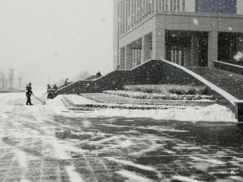 降雪持續一上午,項目人員不懼嚴寒反復清掃園區主干道、辦公樓臺階。對積雪較厚、壓實路段做撒鹽融雪處理,在鐵锨、除雪車“咣咣嚓嚓”中,積雪被鏟除干凈,道路逐漸恢復原貌,全力保障車輛和人員安全出行。